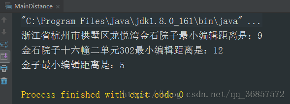 其中minEdit_distance()方法是最小编辑距离算法,根据此算法的思想,如果最小编辑距离值越小,则说明两个字符串越相似.而此处打印结果为9,12,5.即"金子"与"龙悦湾金石院子"最相似,"浙江省杭州市拱墅区龙悦湾金石院子"第二,"金石院子十六幢二单元302"第三,而实际应该是"金子"与"龙悦湾金石院子"最不相似,是不期望得到的结果.