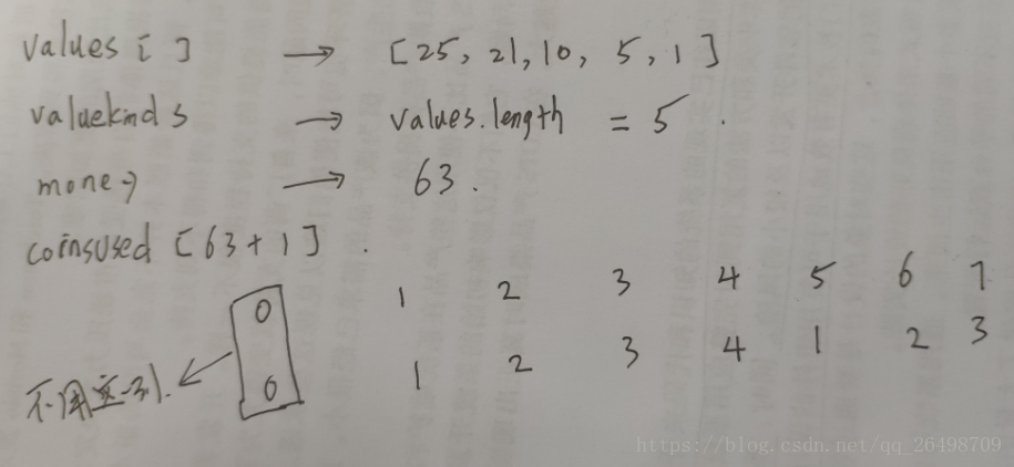 valueKinds :币值不同的硬币种类数量,即values[]数组的大小