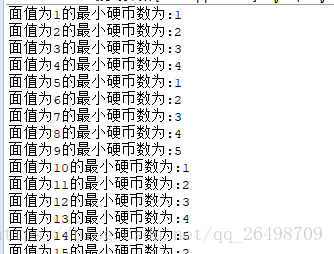 System.out.println("面值为" + i + "的最小硬币数为:" + coinsUsed[i]);