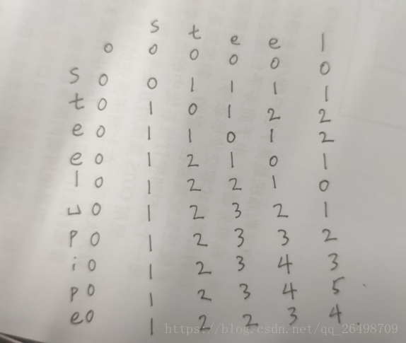 如果 s[i]=t[j],则 cost=0;如果 s[i]!=t[j],则 cost=1。将 d[i,j] 设置为以下三个值中的最小值:
