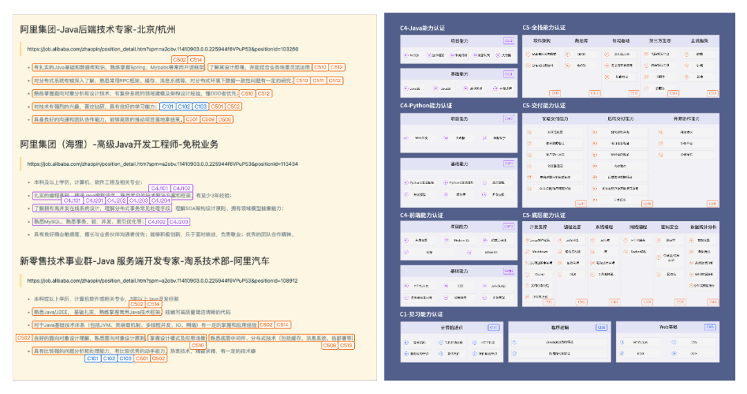 在CSDN软件工程师能力认证的考题中,我们充分考虑到了市场对软件开发工程师技术能力和工程化、交付级能力的要求,将能力认证与企业要求一一对应。以上面提到的招聘启事为例,左图是阿里巴巴招聘要求,右图为CSDN能力测评的题目考查知识点,左图中标有编号的地方即是CSDN软件工程师能力测试中会考察的知识点: