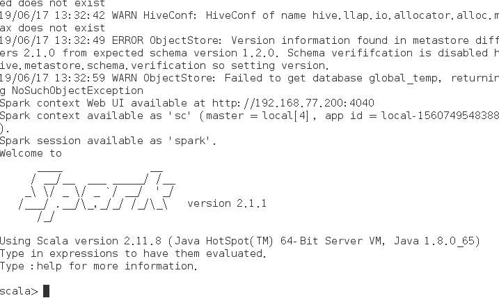 $scala>spark.sql("load data local inpath 'file:///home/centos/data.txt' into table mydb.tt");