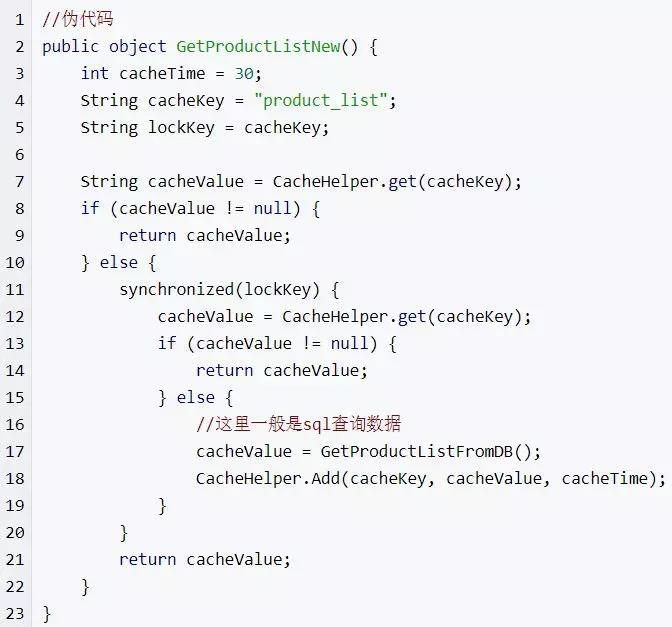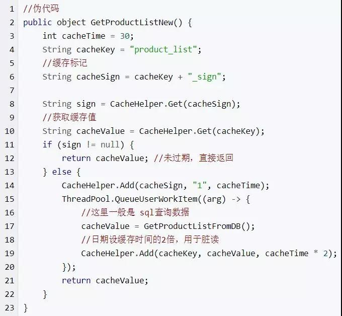 (2)还有一个解决办法解决方案是:给每一个缓存数据增加相应的缓存标记,记录缓存的是否失效,如果缓存标记失效,则更新数据缓存,实例伪代码如下: