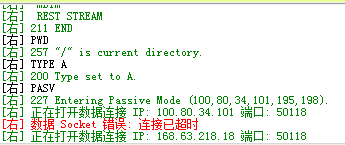 我们发现客户端发送PASV命令后,服务器回传了一个地址100,80,34,101,195,198,这个字符串前4个数字代表IP地址,后两个是端口,而且,每个数字最大255,所以实际的端口号是195*256+198=50118,而IP地址是100.80.34.101,这是虚拟机的内部IP地址。显然,内部IP是无法访问的,于是客户端马上尝试连接外部IP,但由于50118端口没有在Azure防火墙上定义,自然无法连通。