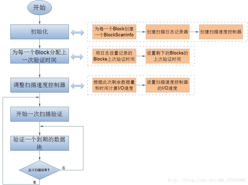 数据节点后台有一个进程DataBlockScanner,定期验证存储在这个数据节点上的所有数据项,该项措施是为解决物理存储介质上的损坏。DataBlockScanner是作为数据节点上的一个后台线程工作的,跟着数据节点同时启动,由于对数据节点上的每一个数据块扫描一遍要消耗较多的系统资源,一次扫描周期的值一般以较大,这就带来另一个问题,就是在一个扫描周期内可能出现数据节点重启的情况,所以为了提高系统性能,避免数据节点在启动后对还没有过期的数据块又扫描一遍,DataBlockScanner在其内部使用了日志记录器来持久化保存每一个数据块上一次的扫描时间,这样数据节点可以在启动之后通过日志文件来恢复之前所有的数据块的有效时间。