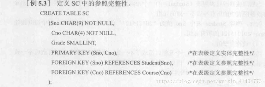 参照完整性 : 关系模型额参照完整性在CREATE TABLE中用FOREIGN KEY 外键定义, 用REFERENCES 短语指明指明这些外键参照哪些表的主键.