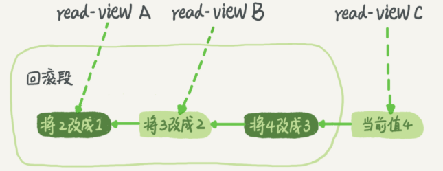 同时你会发现,即使现在有另外一个事务正在将4改成5,这个事务跟read-view A、B、C对应的事务是不会冲突的