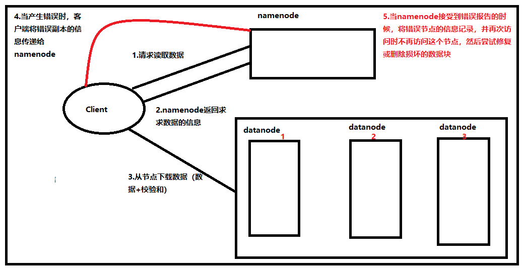 2.下载数据时,客户端会从datanode下载校验和,然后对数据进行校验,如果存在错误,client会将数据报告给namenode,然后如果不存在错误,客户端会将数据报告给datanode,datanode会由此更新日志(datanode持久保存用于验证的校验和日志)