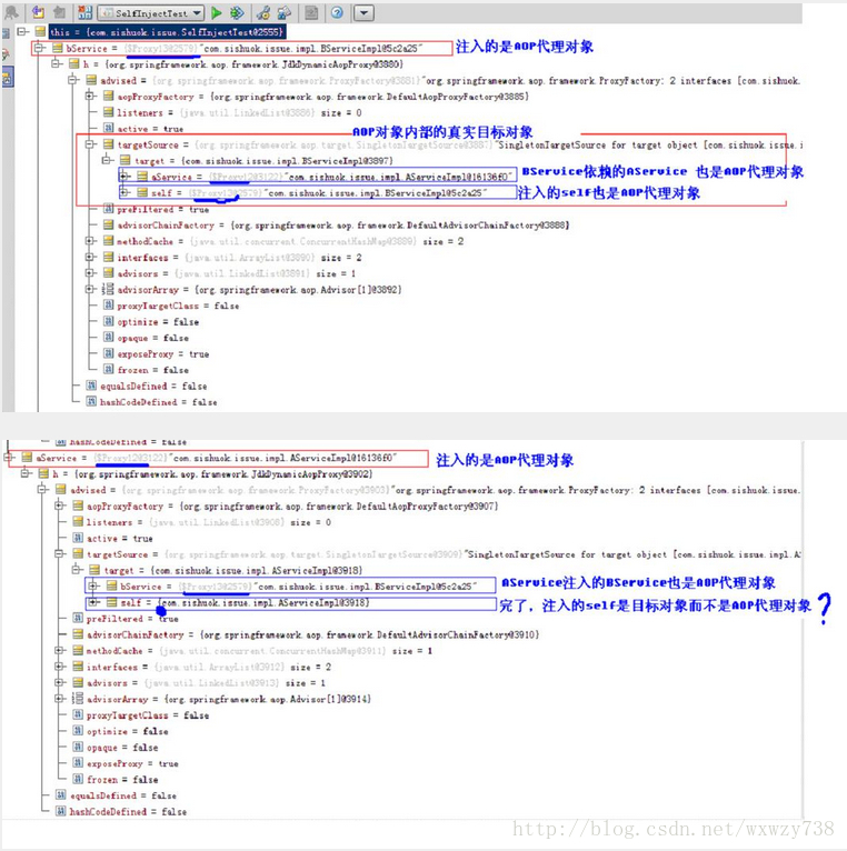 即BService通过InjectBeanSelfProcessor注入代理对象成功,而AService却失败了(实际是注入了目标对象),如下是debug得到的信息: