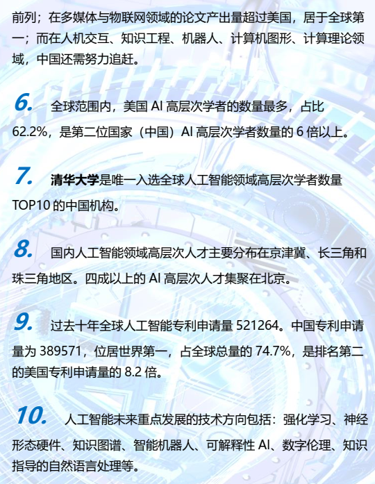 本报告通过对 2020 年人工智能技术成熟度曲线分析,并结合人工智能的发展现状,预测得出人工智能下一个十年重点发展的方向包括:强化学习、神经形态硬件、知识图谱、智能机器人、可解释性 AI、数字伦理、知识指导的自然语言处理等。