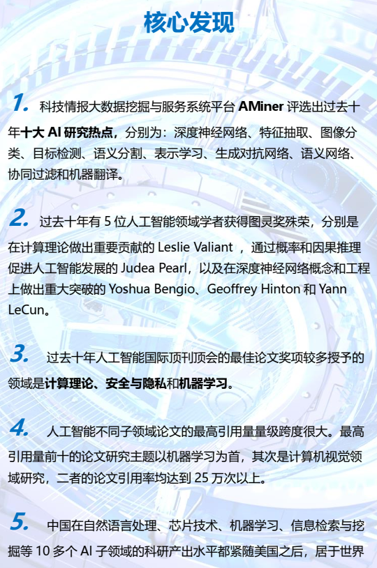 该报告基于清华大学唐杰教授团队自主研发的 “科技情报大数据挖掘与服务平台”(简称 AMiner)平台,根据 2011-2020 年期间人工智能领域的顶级期刊和会议(共计 44 个)所收录的全部论文和专利数据,全面展现了人工智能发展至今所获得的重大科研进展、成果产出以及科研热点。该报告不仅从人才现状、技术趋势和技术影响力等方面展示了过去十年人工智能的最新进展,而且汇总分析了全球主要国家人工智能战略支持政策,以及各国人才储备和专利申请情况。该报告匠心独具,将知识图谱与自然语言处理、可视化、文献计量学等技术手段相结合,分析得到人工智能及其子领域的技术研究热点和发展趋势方向,高层次人才特征。此外,基于 Gartner 技术成熟度曲线,该报告还深入探讨了人工智能的未来发展蓝图,提出理论、技术和应用方面的重大变化与挑战,以及如何赋能其他产业发展等重要议题。