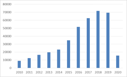 过去十年,中国人工智能领域的专利申请量 389571,位居世界第一,占全球总量的 74.7%,是排名第二的美国的 8.2 倍。总体上,国内的人工智能相关专利申请量呈逐年上升趋势,并且在 2015 年后增长速度明显加快。