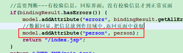 - 当客户进行了数据校验之后,存在数据问题,在给客户响应回去原页面的同时,不仅仅要有校验信息,还应该有客户所填的原始信息,即让客户上次填写的内容还在当前页面展示,这就是数据回显
