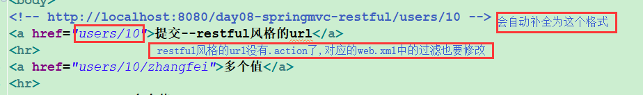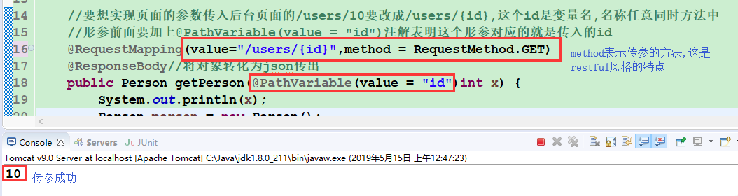 //要想实现页面的参数传入后台页面的/users/10要改成/users/{id},这个id是变量名,名称任意同时方法中