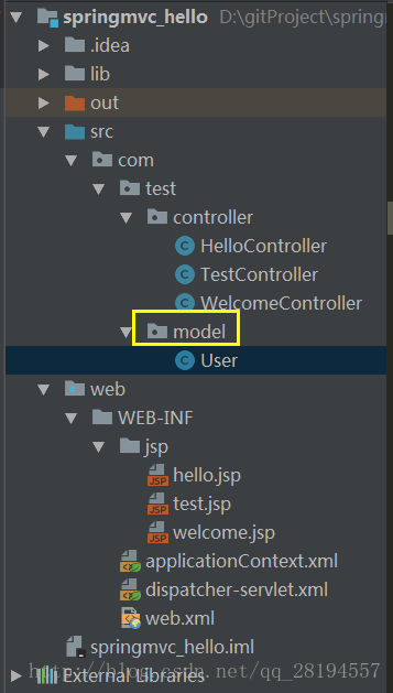 【1】首先创建一个User类,路径为src/com/test/model/User.java。结构图如下所示: