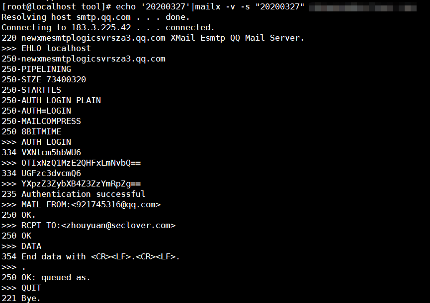 echo '邮件正文'|mailx -v -s "邮件标题" 邮箱地址
