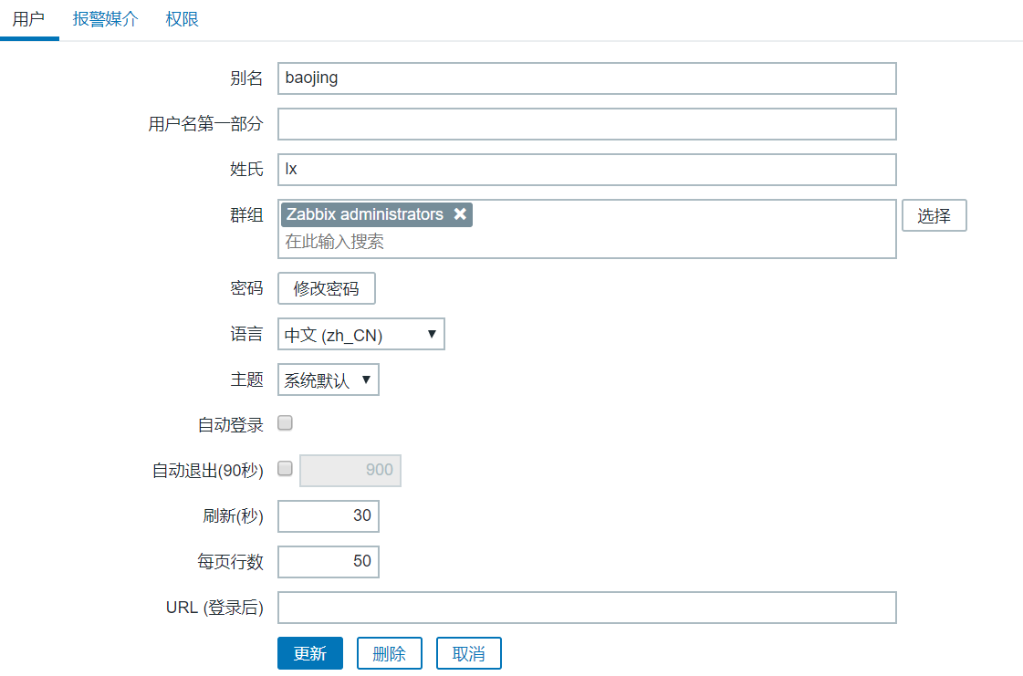 在zabbix web界面选择 管理>用户>添加用户 配置如下