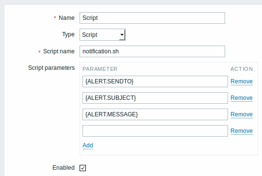 | Script parameters | 向脚本添加命令行参数。{ALERT.SENDTO}, {ALERT.SUBJECT} and {ALERT.MESSAGE} macros 在脚本参数中被支持。 |
