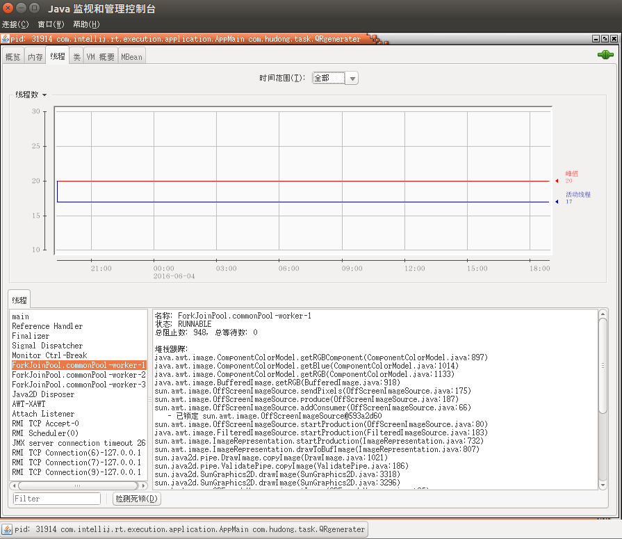 同时使用了java8 并行流,所以看到了开启了多线程,并且线程数量一直稳定在17.