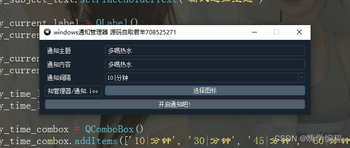 以上就是超级嚓茶最近收集整理的关于用Python做一个电脑通知小工具,超级方便序言效果展示代码实战最后的全部内容,更多相关用Python做一个电脑通知小工具内容请搜索靠谱客的其他文章。