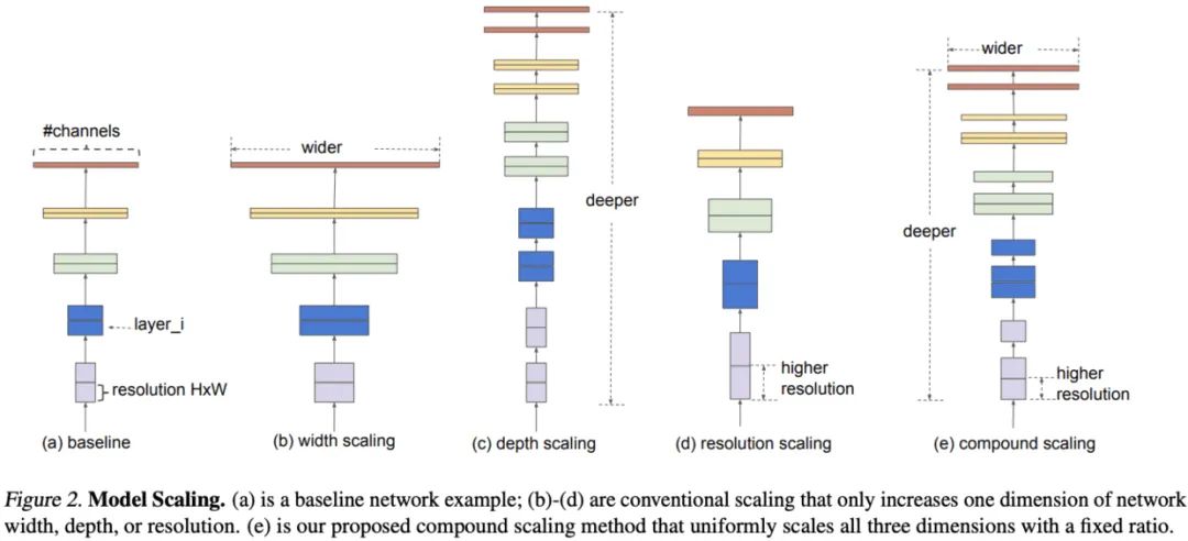 论文对模型缩放进行深入研究,提出混合缩放方法,该方法可以更优地选择宽度、深度和分辨率的维度缩放比例,从而使得模型能够达到更高的精度。另外,论文通过NAS神经架构搜索提出EfficientNet,配合混合缩放方法,能够使用很少量的参数达到较高的准确率。