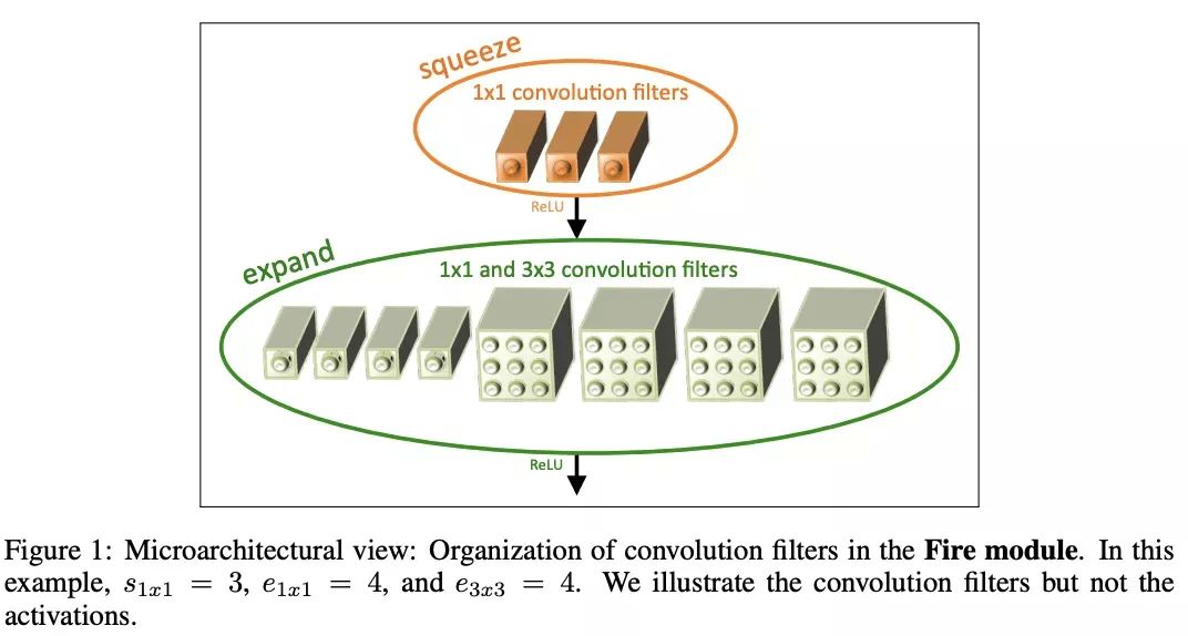 SqueezeNet的核心模块为Fire模块, 结构如图 1 所示, 输入层先通过squeeze卷积层 卷 积)进行维度压缩,然后通过expand卷积层 卷积和 卷积混合)进行维度扩展。Fire模 块包含 3 个参数, 分别为squeeze层的 卷积核数 , expand层的 卷积核数 和 层的 卷积核数 , 一般