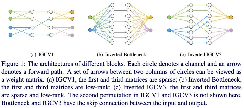 基于IGCV和bootleneck的思想,IGCV3结合低秩卷积核和稀疏卷积核来构成稠密卷积核,如图1所示,IGCV3使用低秩稀疏卷积核(bottleneck模块)来扩展和输入分组特征的维度以及降低输出的维度,中间使用深度卷积提取特征,另外引入松弛互补性原则,类似于IGCV2的严格互补性原则,用来应对分组卷积输入输出维度不一样的情况。