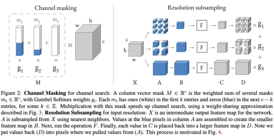 DNAS通过训练包含所有候选网络的超网来采样最优的子网,虽然搜索速度快,但需要耗费大量的内存,所以搜索空间一般比其它方法要小,且内存消耗和计算量消耗随搜索维度线性增加。为了解决这个问题,论文提出DMaskingNAS,将channel数和输入分辨率分别以mask和采样的方式加入到超网中,在带来少量内存和计算量的情况下,大幅增加 倍搜索空间。