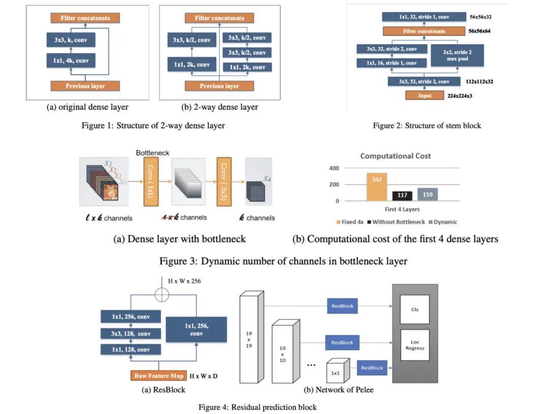 基于DenseNet的稠密连接思想,论文通过一系列的结构优化,提出了用于移动设备上的网络结构PeleeNet,并且融合SSD提出目标检测网络Pelee。从实验来看,PeleeNet和Pelee在速度和精度上都是不错的选择。