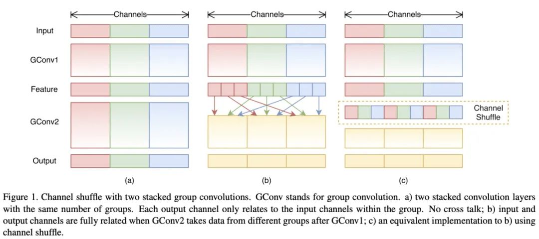 图1b的思想可以简单地用channel shuffle操作进行实现,如图1c所示, 假设包含 组的卷积 层输出为 维,首先将输出reshape()为 , 然后进行transpose 0 , 最后再flatten()回 维。