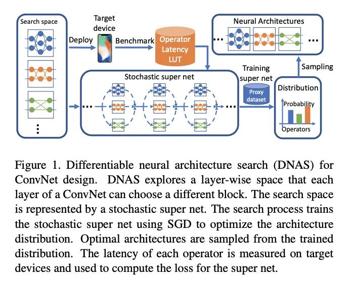 论文提出FBNet,使用可微神经网络搜索(DNAS)来发现硬件相关的轻量级卷积网络,流程如图1所示。DNAS方法将整体的搜索空间表示为超网,将寻找最优网络结构问题转换为寻找最优的候选block分布,通过梯度下降来训练block的分布,而且可以为网络每层选择不同的block。为了更好地估计网络的时延,预先测量并记录了每个候选block的实际时延,在估算时直接根据网络结构和对应的时延累计即可。