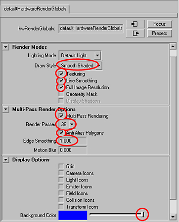 我们将要使用 hardware renderer 渲染我们的场景。如果你希望以双面方式渲染,那么你要做的仅仅是打开 hardware render buffer, 设置成以 wireframe 模式渲染 (render>attributes) 。但是如果你希望以单面线框模式实现,那么继续看下去。