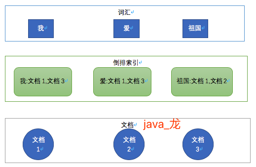 看到上面中文分词器结果,就会有新的疑问,使用中文分词器那样分词效果有什么好处呢? 答案就是根据分词建立词汇与文档关系的倒排索引。这步都是es帮我们做的,下面通过"我","爱","祖国"三个词看看倒排索引,如下图:
