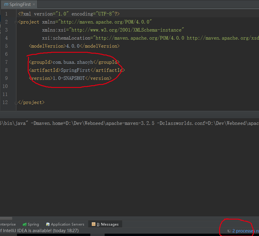 到了这里IDE会自动下载一些配置,稍等一会就能自动配置好。然后打开pom.xml文件,在该配置文件里加入你需要引入的包的名称,你想要什么包都可以去Maven Reposity里查找。