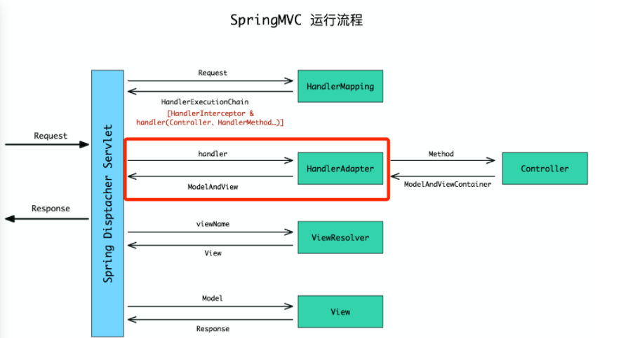 - DispatcherServlet通过HandlerAdapter处理器适配器调用处理器