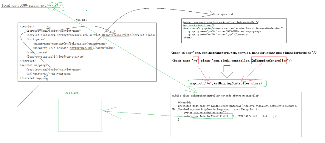 ②配置映射关系 <bean name="/w" class="com.tledu.spring_mvc_basic.controller.XmlMappingController"/>