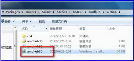 若无效,可手动打开解压出来安装程序,找到“Packages\Drivers\SBDrv\hseries\USB30”目录即USB3.0芯片驱动程序,可手动打开里面“amdhub\W764A”文件夹下“amdhub30.msi”程序手动安装。(32位系统可选择“amdhub\W7”目录下安装程序安装)。如下图所示: