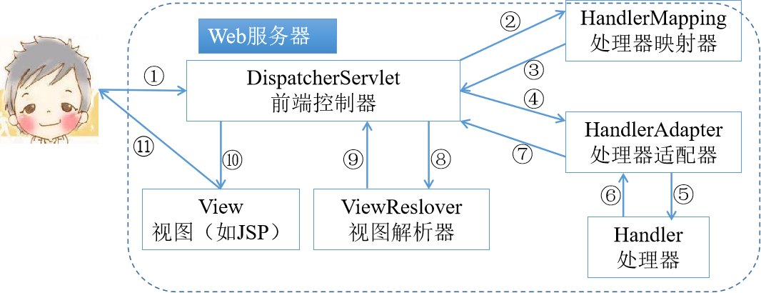 10DispatcherServlet对View进行渲染(即将模型数据填充至视图中); 11视图渲染结果会返回给客户端浏览器显示。