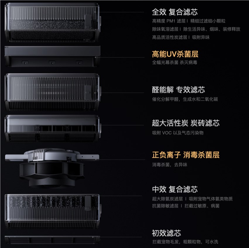 米家全效空气净化器 Ultra 增强版搭载了迄今为止最丰富的空气净化功能:共5组专业滤芯,可以提供10层空气复合净化功能,能够清除室内95种可能存在于室内的空气污染物,可应用于户外空气雾霾污染,室内家装甲醛以及其他有机挥发物,宠物粪便气味,厕所与厨余腥臭异味,易敏季节过敏原等多种潜在影响身体健康的空气污染物的净化与清除。同时米家全效空气净化器 Ultra 增强版配备了8种室内空气环境参数高精度传感器,实时监控室内空气质量,让家中无形的空气质量一目了然。