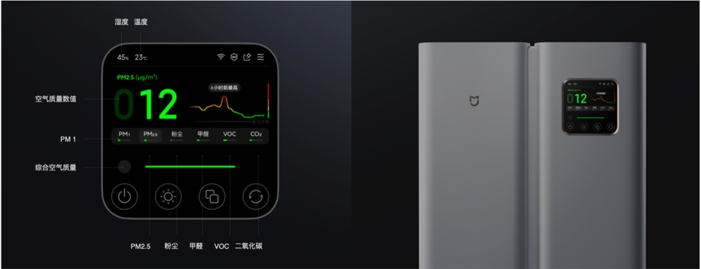 米家全效空气净化器 Ultra 增强版内置的彩色显示屏可以实时显示8种空气质量参数,PM1、CO₂、VOC、甲醛、PM2.5、粉尘、温度、湿度8大数据一目了然,可实时监测的私人空气数据站。无需打开APP,也可直接在机器的显示屏上观察到当前室内的空气质量参数以及变化趋势。
