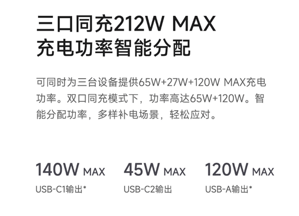 这款充电宝可同时为三台设备提供 65W、27W 和 120W 充电功率,或为两台设备提供 65W 和 120W 充电功率。