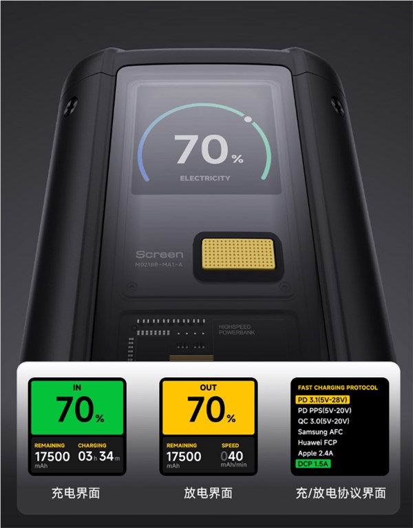 该充电宝采用三面透壳设计,彩屏可显示电量、充电速度和协议信息。
