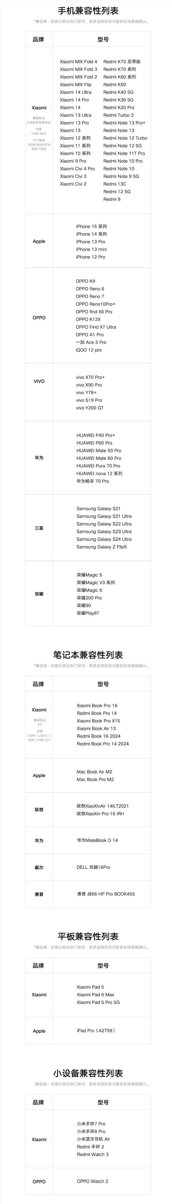 除小米手机外,该充电宝还兼容 iPhone、OPPO、vivo、华为、三星、荣耀等手机,以及小米、苹果、联想、戴尔等笔记本,并兼容部分平板和手环。