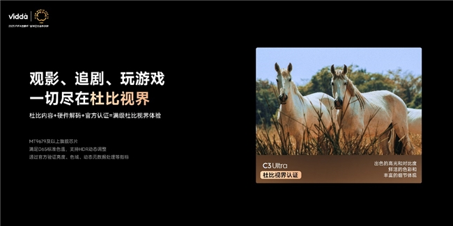 Vidda C3 系列拥有杜比视界、HDR10+、IMAX、电影制作人模式等专业影院画质认证,足以证明其同级画质天花板的实力。杜比实验室商业合作部全球副总裁Javier Foncillas表示:“通过杜比视界,Vidda C3 系列将为用户带来令人惊艳的视觉体验。你可以在喜爱的娱乐内容中,感受到更绚丽的色彩、更鲜明的对比度和更丰富的细节。预祝海信Vidda C3 系列大获成功!”