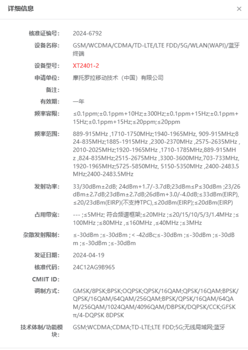 日前,型号为XT2401-2的摩托罗拉手机在国内获得了无线电核准,预计这款手机是即将发布的moto X50 Ultra。