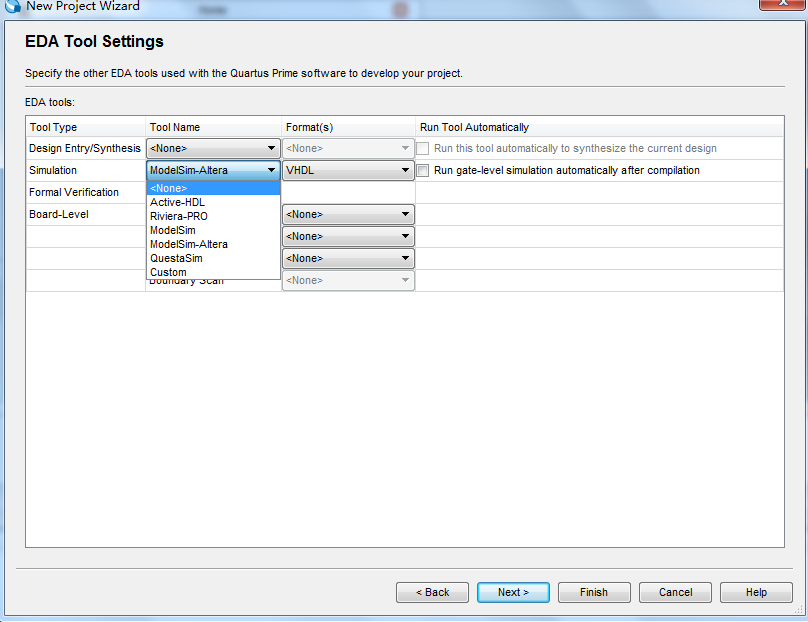 暂时不需要仿真,simulation选择none,如何需要,先安装modelsim 打包文件中有该软件安装包