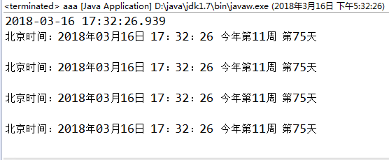 public static void main(String[] args) { //(1) java.util.Date time1 = new java.util.Date(); //(2) java.sql.Date time2 = new java.sql.Date(System.currentTimeMillis()); //(3) java.sql.Time time3 = new java.sql.Time(System.currentTimeMillis()); //(4) java.sql.Timestamp time = new java.sql.Timestamp(System.currentTimeMillis()); System.out.println(time); DateFormat sdf = new SimpleDateFormat("yyyy年MM月dd日 HH:mm:ss 今年第ww周 第DD天"); System.out.println("北京时间:" + sdf.format(time1) + "n"); System.out.println("北京时间:" + sdf.format(time2)+ "n"); System.out.println("北京时间:" + sdf.format(time3)+ "n"); System.out.println("北京时间:" + sdf.format(time)+ "n"); }