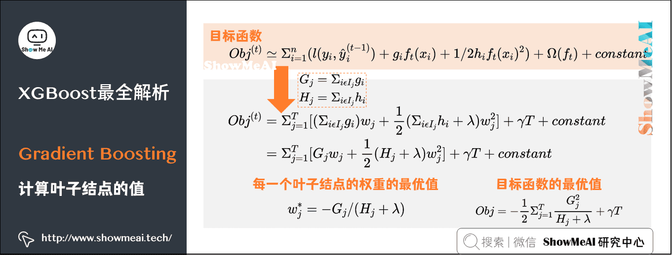 O b j = ∑ j = 1 T [ G j w j + 1 2 ( H j + λ ) w j 2 ] + γ T Obj = sum_{j=1}^{T} Big[ G_j w_j + frac{1}{2}(H_j + lambda) w_j^2 Big] + gamma T Obj=j=1∑T[Gjwj+21(Hj+λ)wj2]+γT