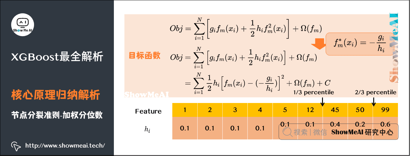 在近似算法取分位数时,实际上XGBoost会取以二阶导 h i h_i hi为权重的分位数(Weighted Quantile Sketch),如下图表示的三分位。