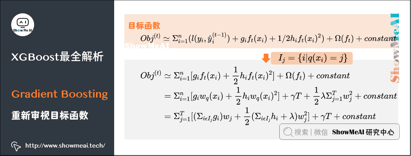 下面是一个数学转换处理,为了使正则项和经验风险项合并到一起。我们把在样本层面上求和的经验风险项,转换为叶节点层面上的求和。